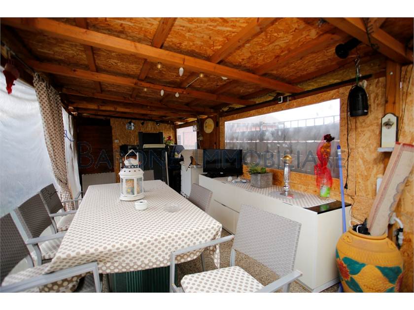 Il giardino gira sui due lati dell'appartamento, diviso in una praticissima zona lavanderia, una piccola corte e la maggior parte in erba. Internamente quasi tutti gli ambienti di casa hanno un accesso all'esterno, nell'ordine: sala, cucina, bagno, tre stanze da letto di cui una con bagno interno.