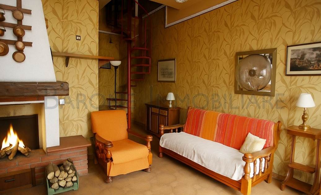 Corridoio di ingresso, due grandissime camere matrimoniali con terrazzo comune, bagno con antibagno, cucinotto e sala con camino e altro terrazzo. Dalla sala, una scala a chiocciola porta allo spazio mansardato, utilissimo come ripostiglio.