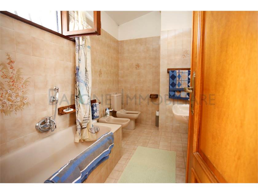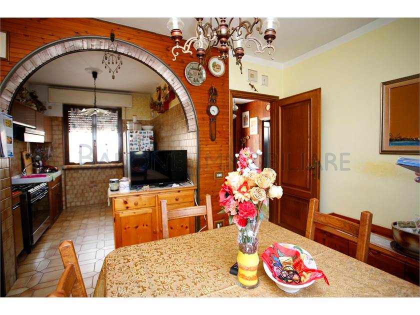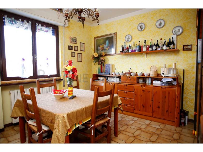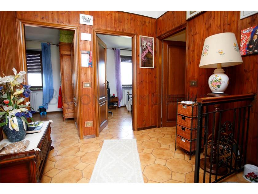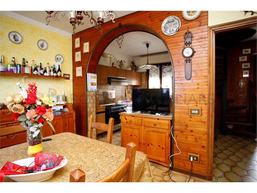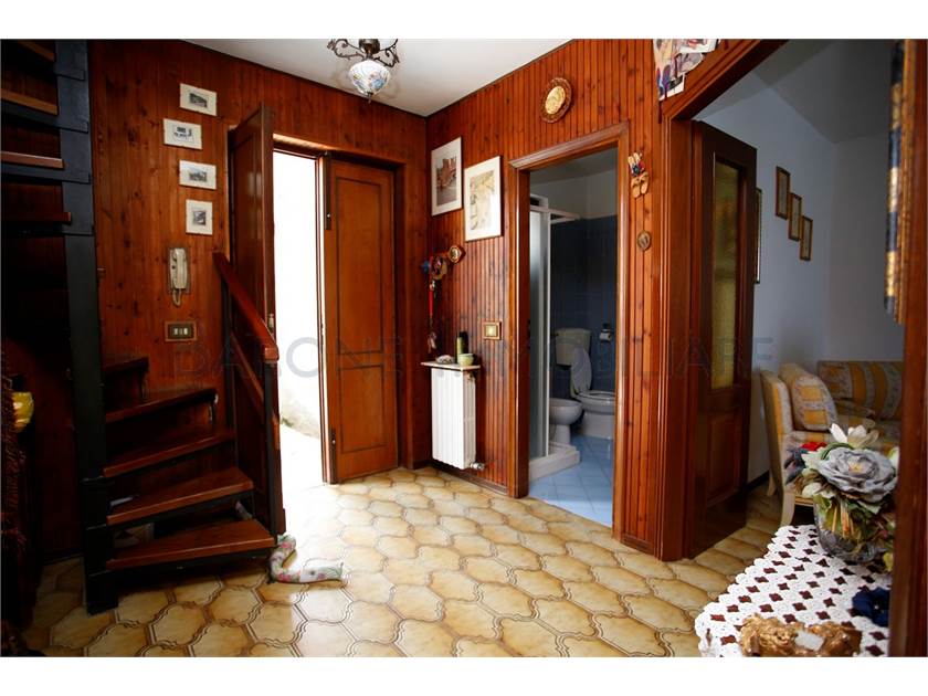 Ingresso su ampio disimpegno, comoda cucina con tinello, sala e bagno; scala a chiocciola che sale e porta a due camere singole, una matrimoniale e a un altro bagno.