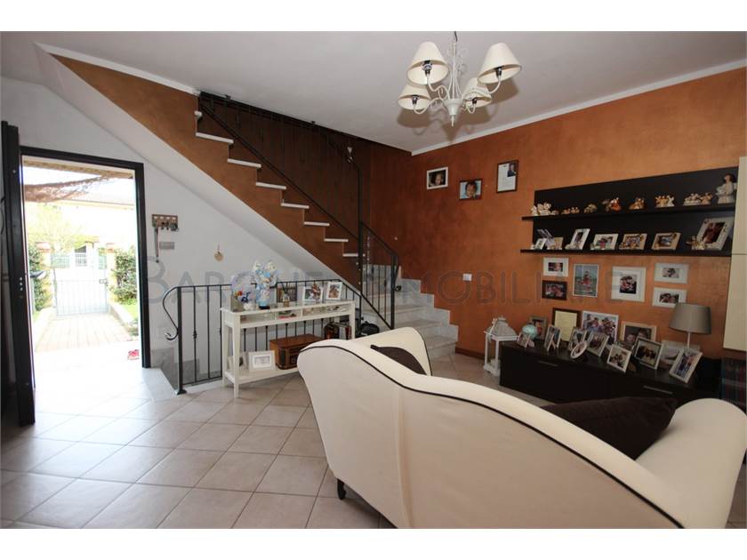 Dall'ampio giardino di ingresso si accede al comodo soggiorno di ingresso che ha il bagno di servizio con un comodo antibagno e ad una camera che oggi viene utilizzata come stireria-lavanderia, ma che potrebbe essere una comoda cucina, oppure una cameretta o uno studio, il tutto si affaccia sul giardino sul retro che ha una grande pompeiana e un'ampia zona verde.
